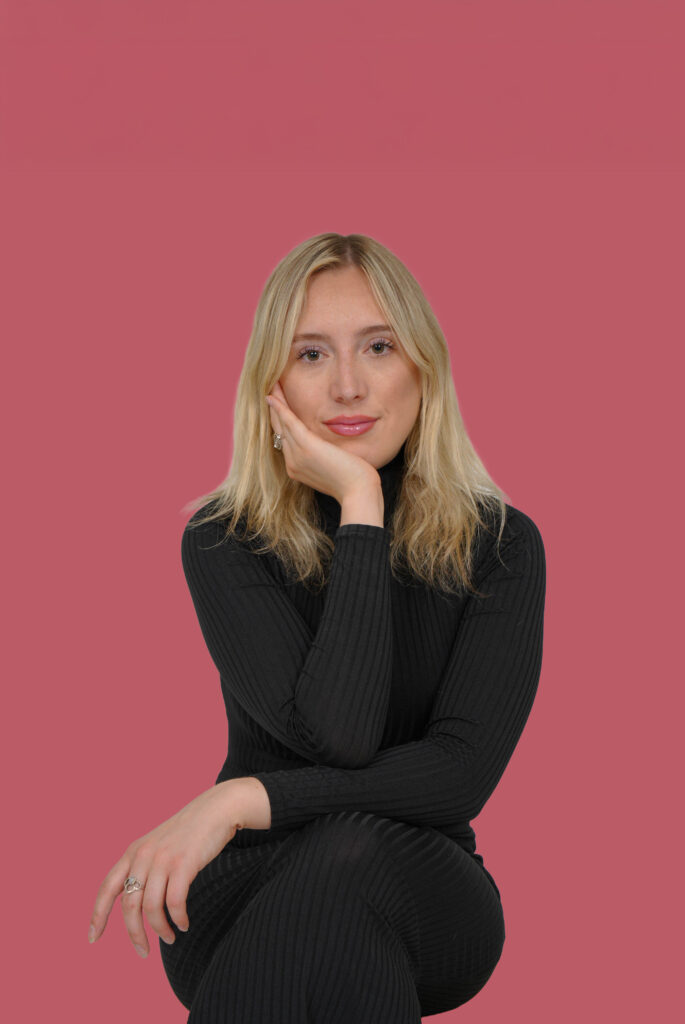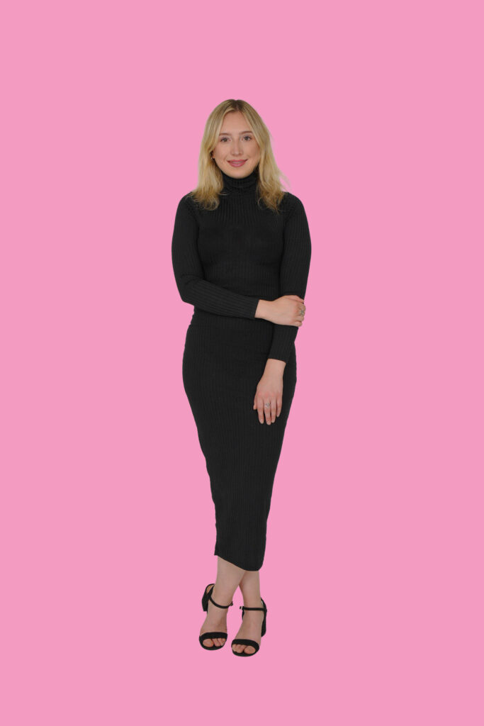 2. Background and wardrobe harmony – Choosing the right colour palette is essential. For this shoot, I matched pink backgrounds with my minimalist black dress – chic, professional, and full of contrast. It instantly draws attention to the subject (in this case myself).