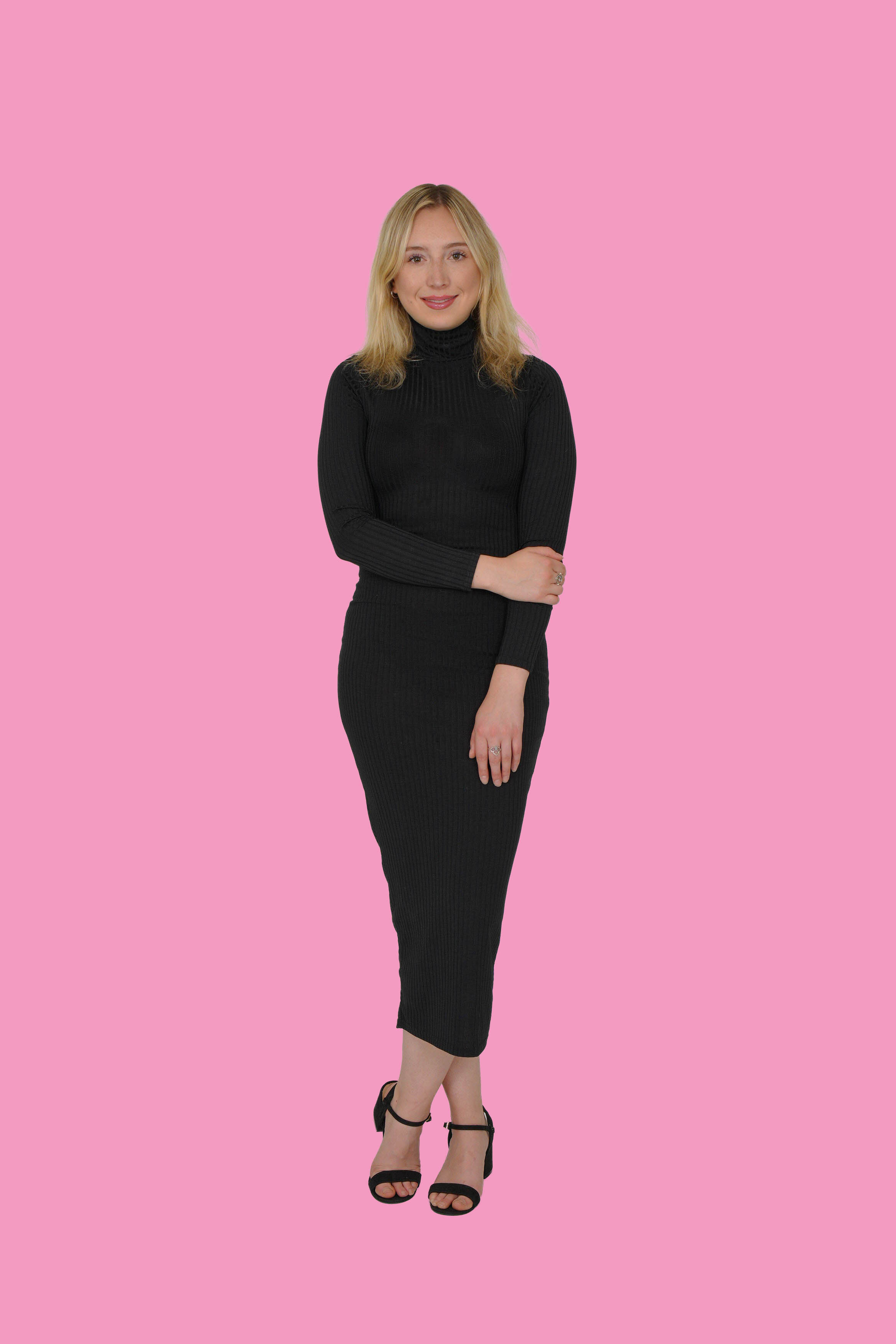 For this shoot, I ditched the usual corporate grey and brought in punchy pink backdrops to add playful and optimistic tones. For this shoot, I wore a classic black ribbed dress that popped perfectly against both dusty rose and bubblegum hues. This is a smart casual dress to bring professionalism, but also, keep that playful atmosphere.